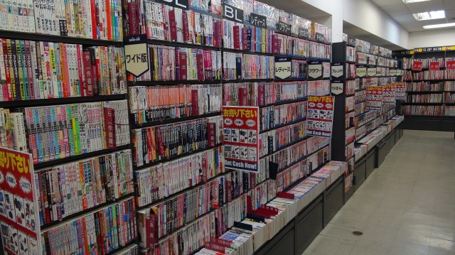 Alcuni titoli esposti in un negozio di manga in Giappone